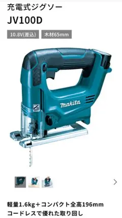 10.8V差込式バッテリの充電式ジグソーで、1.6kg・全高196mmのコンパクトモデルです。オービタル3段+ストレート切替で軟鋼板の切断にも対応しており、差込式バッテリのラインナップで使いたい人向けの一台ですね。パワーは控えめですがDIYの薄板加工には十分。中古ではブレードホルダ、ベースの直角精度、差込式バッテリ端子の状態を確認してください。セット品なら本体・バッテリー・充電器がまとめて手に入ります。