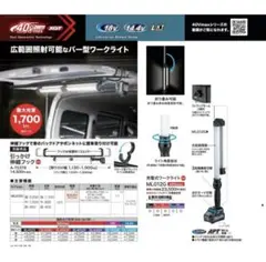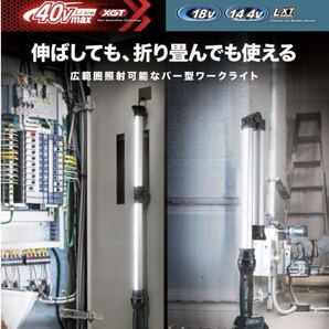 40Vmaxのバー型ワークライトで、ライト部630mmの広範囲照射により最大光束1,700lm。 上部と下部の2カ所にライトを配置し、全灯・上部のみ・下部のみの3パターンで点灯モードを切り替えられます。 折りたたみや伸縮フックでの車内取り付けにも対応し、配電盤点検や仮設照明に便利です。